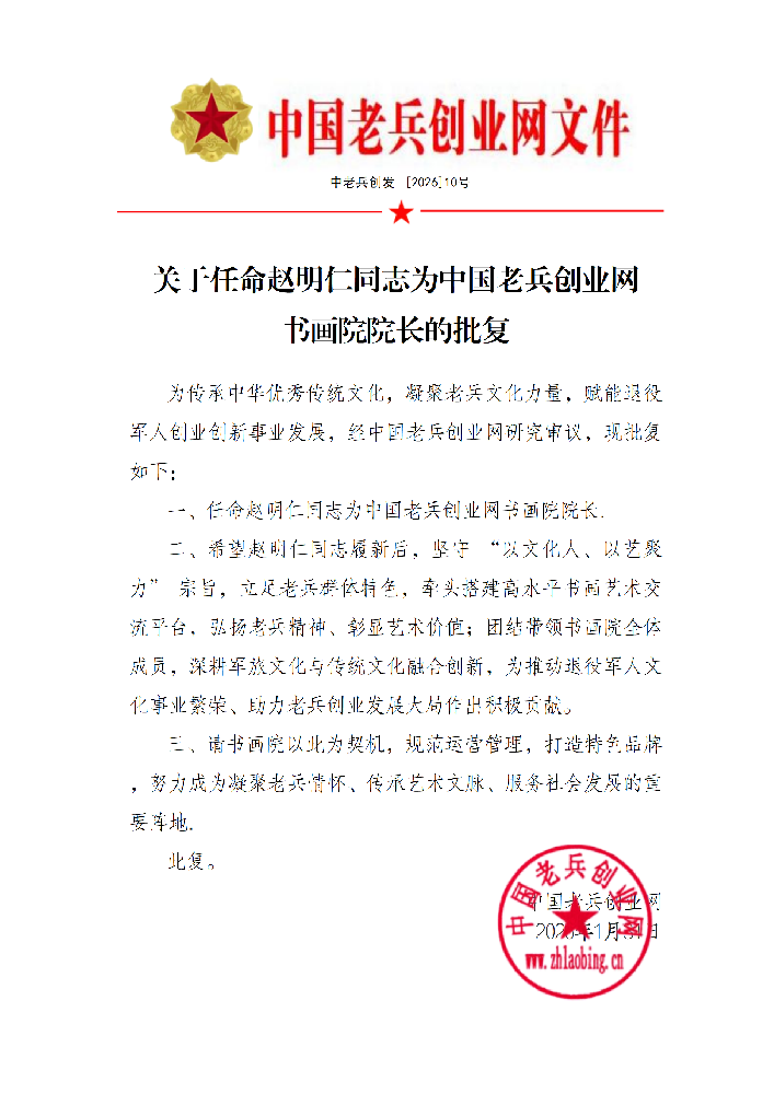 关于任命赵明仁同志为中国老兵创业网 书画院院长的批复